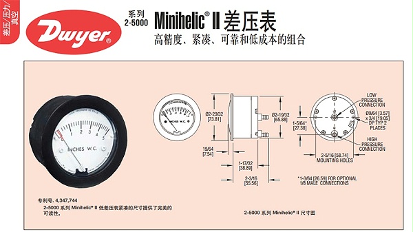 dwyer差压表2-5000系列紧凑型压力表,不仅容易读数,而且可在 30psig的总压下稳定工作。意外超过量程范围将不会对压力表造成损坏。常用于包括空气吹洗、医用呼吸设备、空气取样器、气流罩和电子空气冷却系统。