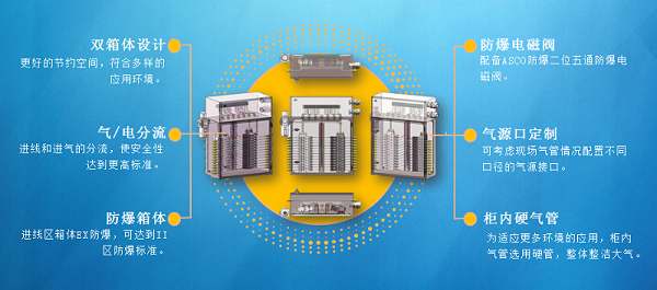 阀箱机柜,采用分体式组合形式的机柜外壳,上半部是ex防爆接线箱,配备防爆铠装接头。下半部是不锈钢高防护电磁阀箱。电磁阀采用asco防爆电磁阀,二位五通气控电磁阀,符合防爆区域要求,柜内微正压定制型高防护一体式,不锈钢接头配合柜内微正压控制。在满足气阀呼吸动作的同时预防一切an全隐患。